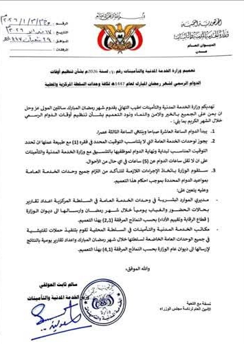 أصدرت وزارة الخدمة المدنية والتأمينات تعميمًا رسميًا رقم (1) لسنة 2026م، قضى بتنظيم أوقات الدوام الرسمي في مختلف وحدات الخدمة العامة خلال شهر رمضان المبارك للعام 1447هـ، وذلك في أول تعميم يصدر عقب تسلّم الوزير سالم ثابت العولقي مهام منصبه.