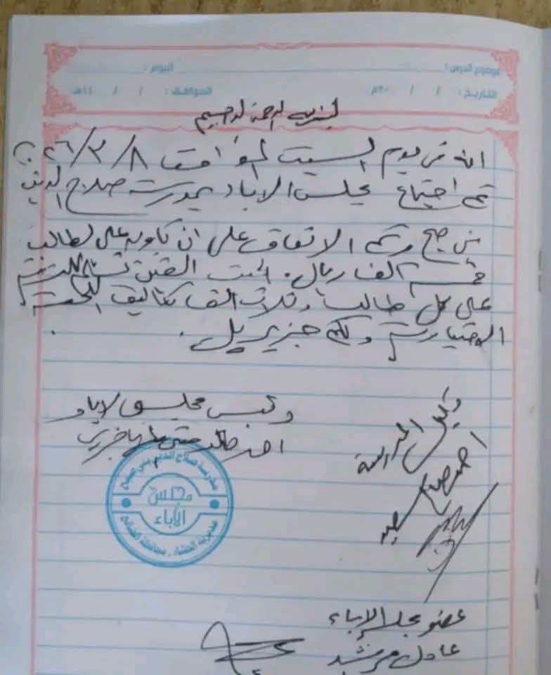 وذكرت وثيقة حصلنا على وثيقة تثبت تلك الادعاءات، أن الطلاب أُجبروا على دفع مبلغ 5 آلاف ريال يمني لكل منهم تحت مسمى "تكاليف اللجنة الاختبارية"، مما أثار استياءً واسعًا في صفوف الأهالي والطلاب، خاصة في ظل الظروف الاقتصادية المتدهورة التي تعيشها البلاد.