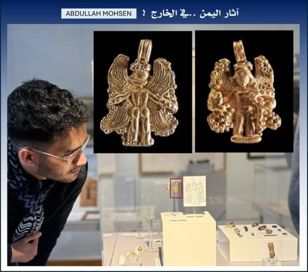 وأضاف أن القلادة ظهرت ضمن مقتنيات الدبلوماسي والمؤرخ الألماني الراحل فيرنر داوم، والتي عُرضت في متحف فينكلمان بمدينة شتندال، إلى جانب مجموعة آثار جمعها خلال عمله واهتمامه بتاريخ اليمن.
